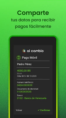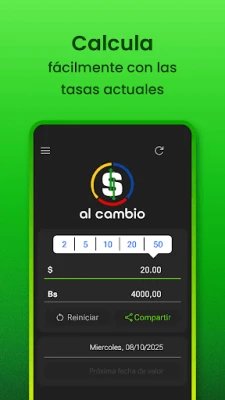 A ferramenta não se limita a simples consultas. Utilize a calculadora inteligente de Al Cambio, que opera com a taxa vigente ou antecipa a próxima taxa BCV, permitindo comparações estratégicas. Com uma precisão elevada, todos os cálculos agora incorporam cada decimal publicado pelo BCV, garantindo resultados mais exatos. Acompanhe a dinâmica do dólar através de gráficos interativos de 7, 30 e 90 dias, e compartilhe seus resultados instantaneamente via WhatsApp ou outras plataformas. Para maior conveniência, crie e gerencie seus Perfils de Pagamento, facilitando o envio e recebimento de informações bancárias para transações como Pago Móvil, contas nacionais e Zelle.