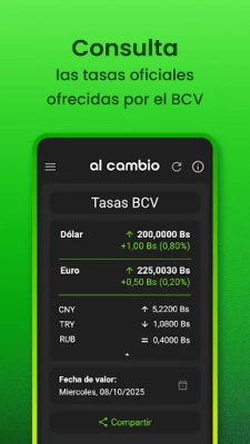 Desvende o complexo mundo das moedas com Al Cambio, seu assistente financeiro definitivo para a realidade venezuelana. Mantenha-se atualizado com as taxas oficiais do Banco Central de Venezuela (BCV) para Dólar e Euro, e realize conversões precisas para Bolívares, Pesos Colombianos (COP) e Reais Brasileiros (BRL). Al Cambio eleva a experiência de consulta e conversão, proporcionando uma visão clara e objetiva para suas decisões financeiras diárias, sempre com base em dados rigorosamente oficiais.