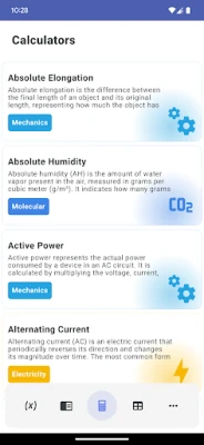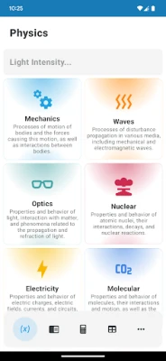 No coração de Physics - Formulas and Calculators reside uma vasta biblioteca: mais de 280 termos, expressões e designações característicos, além de mais de 250 fórmulas cruciais, todas cuidadosamente categorizadas pelas principais áreas da física, acompanhadas de descrições concisas e a designação de suas variáveis. Para a aplicação prática, conte com mais de 180 calculadoras dedicadas, prontas para auxiliar na resolução de problemas, equações ou exemplos complexos. Adicionalmente, uma coleção de tabelas interativas oferece uma maneira dinâmica de assimilar tópicos, trabalhar proativamente com materiais de estudo e preencher lacunas no seu entendimento.